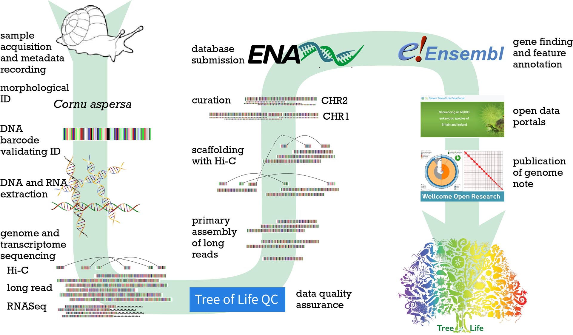 Finally we write a short publication, written by the collectors, and taxonomists as well as the genome scientists at Sanger and EBI, that introduces the species, describes the process used to sequence it, summarises the data and the assembly quality, and announces that the genome is open for all to use. These Genome Notes are published at Wellcome Open Research (https://wellcomeopenresearch.org/gateways/treeoflife).