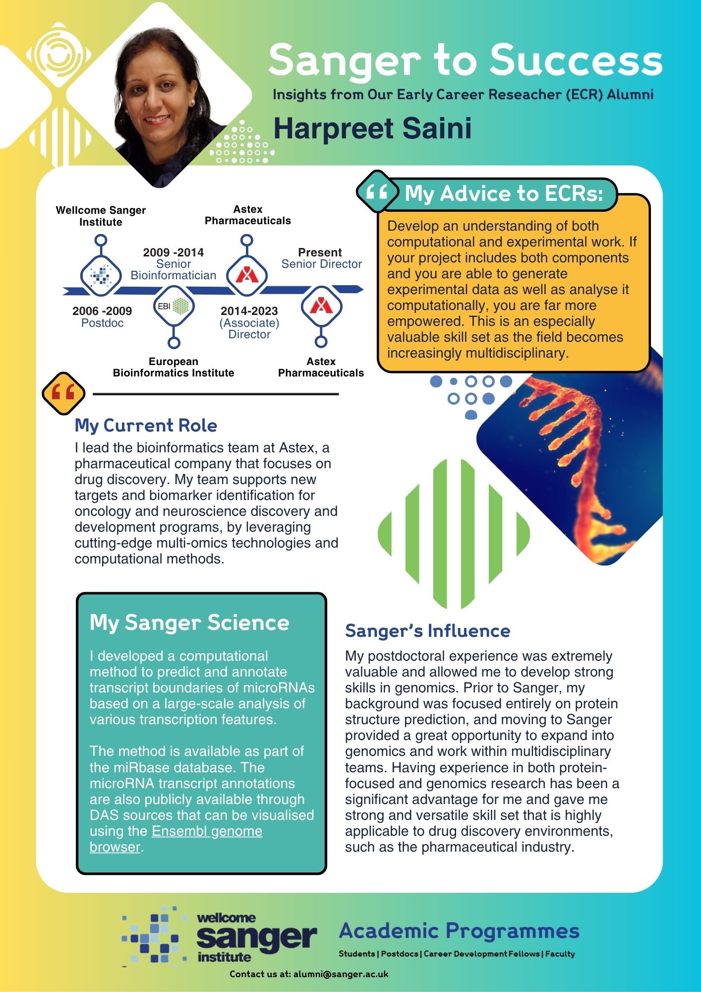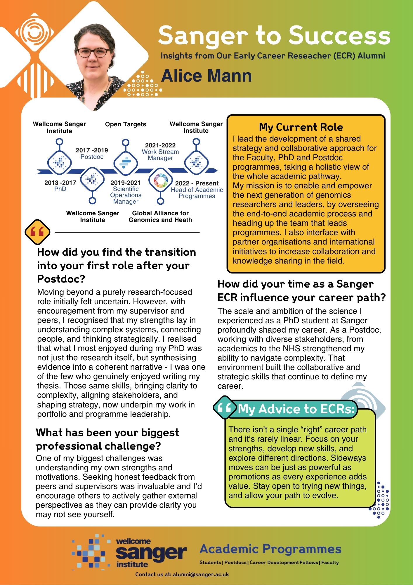 Explore the graphics below to discover each alumni story and stay tuned as we continue to celebrate the impact of Sanger alumni across science and beyond.